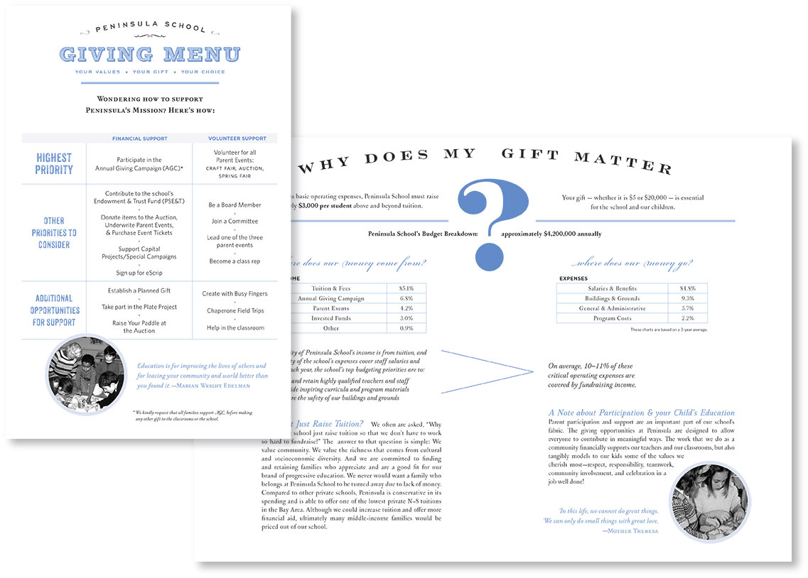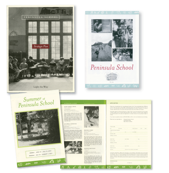 Design of various materials for non-profits such as Pie Ranch, Pescadero; Peninsula School, Menlo Park; Golden Gate National Parks Conservancy, San Francisco, and more.